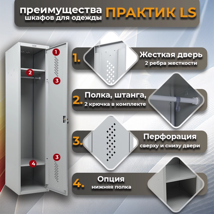 Шкаф для одежды ПРАКТИК LS 21-80 — это надежное и удобное решение для хранения сменной одежды и личных вещей. Отличается прочностью, функциональностью и современным дизайном, что делает его отличным выбором для офисов, производственных предприятий, спортивных объектов и других помещений.